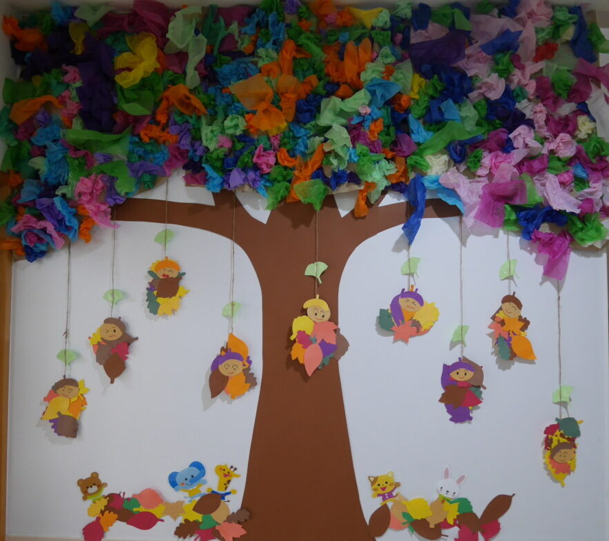 0・1歳児さんは大きく、2歳児さんは小さくフラワーペーパーを丸めて木を作りました😊